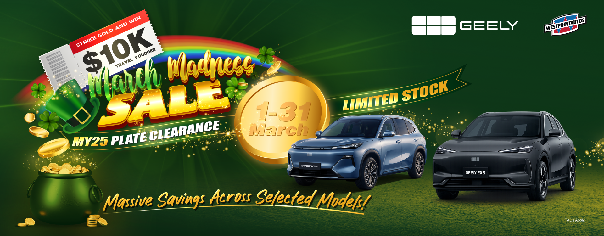 *Terms & Conditions apply. This promotion is conducted by Westpoint Autos Springwood Geely of 3480 Pacific Hwy, Springwood (“the Promoter”) and is open to Queensland residents aged 18 years or over, excluding employees of the Promoter and their immediate families, as well as ABN holders purchasing in a business capacity, fleet, rental or government buyers. The promotion commences at 12:00am AEST on 1 March 2026 and closes at 11:59pm AEST on 31 March 2026 (“Promotion Period”). To be eligible, customers must purchase any new or demonstrator (demo) MY25 Plate model vehicle from the Promoter and take delivery of the vehicle between 1 March 2026 and 31 March 2026. Eligible retail customers will automatically receive one (1) entry into the prize draw, with strictly one (1) entry permitted per customer regardless of the number of vehicles purchased. The prize is one (1) $10,000 AUD travel voucher. The voucher supplier will be determined by the Promoter and the prize is not transferable, exchangeable or redeemable for cash. The draw will take place at the Promoter’s premises on 1 April 2026. The winner will be selected at random and notified by phone and/or email within two (2) business days of the draw. If the winner cannot be contacted within fourteen (14) days, the Promoter reserves the right to conduct a redraw. The Promoter reserves the right to verify the validity of entries and to disqualify any entrant who tampers with the entry process. The Promoter’s decision is final and no correspondence will be entered into. If for any reason this promotion is not capable of running as planned, the Promoter reserves the right to modify, suspend or cancel the promotion, subject to any directions from a regulatory authority. By participating in this promotion, entrants agree to be bound by these Terms and Conditions.